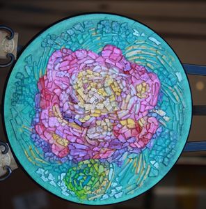 I use tempered glass to create colorful mosaics. The glass is on top of my artwork which is made with acrylics, bronzing powders and sparkle. Sometimes I also add grout to the mosaics to accentuate the tempered glass pieces. I can use salvaged wood windows to frame the mosaics for a unique look.